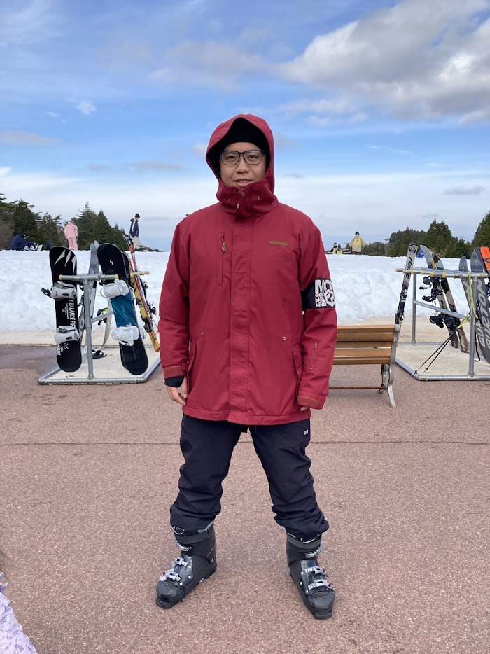滑雪身上會有滑雪服、雪鞋還有拿雪板,身上大概會有十多公斤,所以走路的時候會很吃力,所以摔到中午也差不多累了。