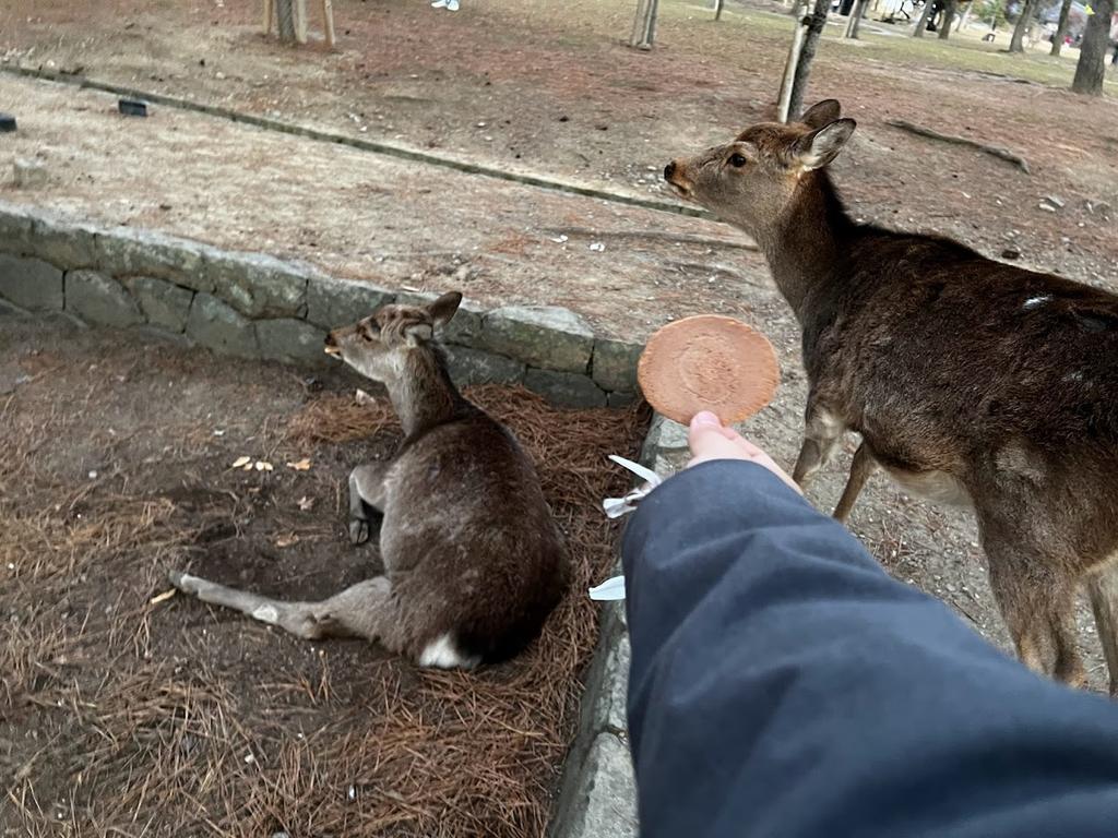 我剛買好鹿餅的時候,還沒轉身就有一隻鹿從我身後衝過來,咬著我前一天剛買的外套,我只好把還沒拆封的一整疊十片鹿餅給他,贖回我的外套 QQ