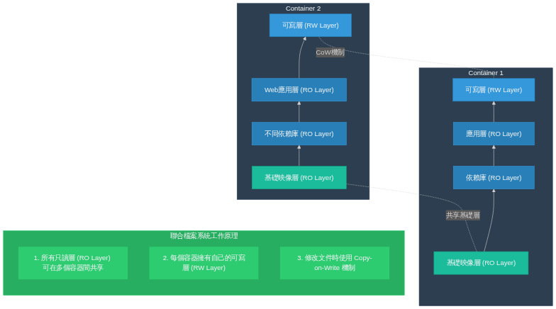 - Copy-on-Write(CoW)機制:修改檔案時,將檔案從只讀層複製到可寫層進行操作,原層不變。