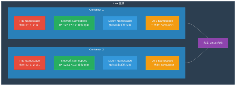 - PID Namespace(程序隔離):為容器提供獨立的程序 ID 空間,容器內的程序對主機和其他容器不可見。
