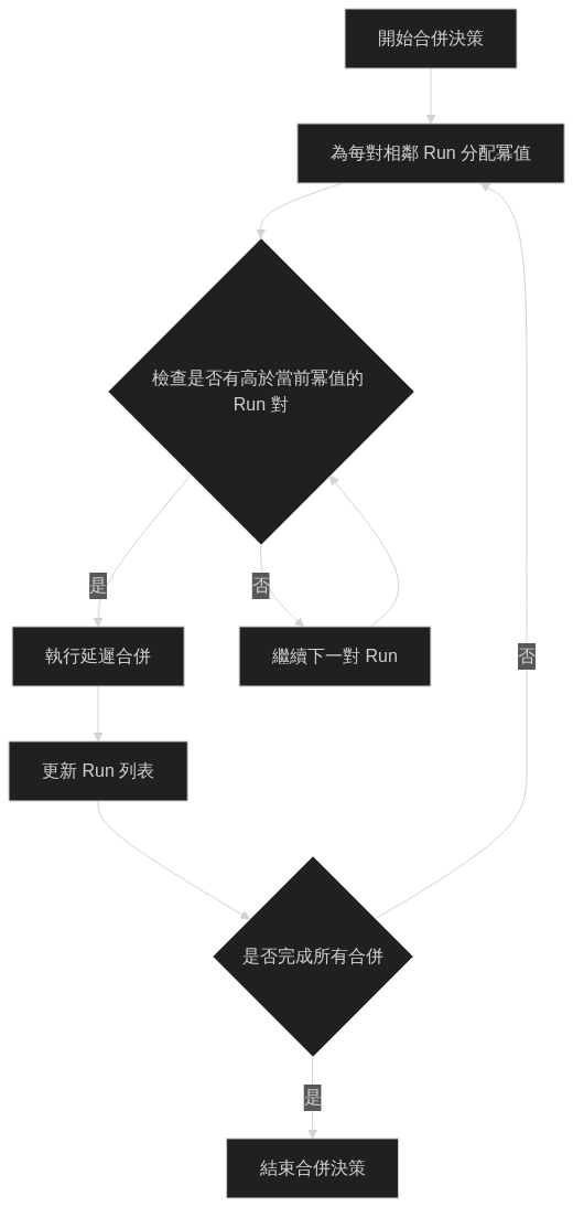 - 當新的 Run 對出現時,執行所有較高冪值的延遲合併